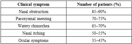 Clinical studies conducted in patients with allergic rhinitis provide important information regarding the clinical course of the disease, the severity of symptom manifestation, structural changes in the nasal mucosa, and the functional status of nasal breathing. The study included patients of different ages and sexes, in whom clinical symptoms, rhinoscopic findings, and functional parameters were assessed in a comprehensive manner. The obtained results demonstrated the heterogeneous nature of the clinical presentation of allergic rhinitis and highlighted the necessity of an individualized approach to diagnosis and treatment.During the study, the main complaints of the patients were analyzed in detail. Clinical observations revealed that nasal obstruction was the leading symptom in the majority of patients with allergic rhinitis. Most patients reported difficulty in nasal breathing with fluctuations in severity throughout the day, with a marked worsening during nighttime. Paroxysmal sneezing, watery rhinorrhea, and nasal itching were also among the most frequently reported symptoms. In some patients, ocular symptoms such as itching, tearing, and redness were observed, corresponding to the clinical features of allergic rhinoconjunctivitis.According to the results of clinical examination, both the duration and severity of symptoms varied considerably among patients. In individuals with seasonal allergic rhinitis, symptoms predominantly intensified during specific seasons, whereas in patients with perennial allergic rhinitis, symptoms exhibited a more persistent course. This distinction is of significant importance for the clinical classification of the disease and also influenced the results of subsequent functional assessments. The results of the conducted clinical and functional studies provide a comprehensive characterization of the clinical course of allergic rhinitis, the severity and variability of symptoms, morphological changes of the nasal mucosa, and impairments in nasal breathing function. The integrated assessment of subjective complaints, objective clinical findings, and functional parameters allowed for an in-depth evaluation of disease heterogeneity and emphasized the necessity of an individualized approach to diagnosis and management.The study population included patients of different age groups and both sexes, which enabled a broad analysis of clinical manifestations across demographic categories. The mean age of patients was within young and middle adulthood, reflecting the known epidemiological profile of allergic rhinitis. The disease duration varied from newly diagnosed cases to long-standing chronic forms, which allowed for the assessment of symptom progression and functional deterioration over time.Clinical Symptom AssessmentAnalysis of patients’ complaints revealed that nasal obstruction was the most prevalent and clinically significant symptom. The majority of patients reported persistent or intermittent difficulty in nasal breathing, which often intensified during nighttime and early morning hours. Many patients described fluctuations in symptom severity throughout the day, influenced by environmental exposure to allergens, physical activity, and climatic conditions.Paroxysmal sneezing was another frequently reported symptom, often occurring in series and triggered by exposure to allergens such as pollen, house dust, or animal dander. Watery rhinorrhea was commonly observed and was typically associated with increased nasal secretion during periods of allergen exposure. Nasal itching, although less prominent than nasal obstruction and rhinorrhea, was still reported by a substantial proportion of patients and often accompanied sneezing episodes.Ocular symptoms, including itching, tearing, and conjunctival redness, were documented in a considerable number of patients, indicating the presence of allergic rhinoconjunctivitis. These symptoms were more common in patients with seasonal allergic rhinitis and often coincided with peak allergen exposure periods. The presence of ocular symptoms was associated with greater overall disease burden and reduced quality of life.Table 1 summarizes the frequency of major clinical symptoms observed in patients with allergic rhinitis.Table 1. Frequency of Major Clinical Symptoms in Patients with Allergic Rhinitis  |