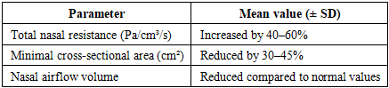 The data presented in Table 1 demonstrate that nasal obstruction remains the dominant clinical manifestation of allergic rhinitis, followed by sneezing and rhinorrhea. These findings are consistent with established clinical descriptions of the disease and underscore the central role of nasal airflow impairment in symptom perception.Seasonal and Perennial FormsFurther analysis revealed notable differences between seasonal and perennial forms of allergic rhinitis. Patients with seasonal allergic rhinitis typically experienced symptom exacerbation during specific periods of the year, corresponding to pollen seasons. In contrast, patients with perennial allergic rhinitis reported persistent symptoms throughout the year, with less pronounced seasonal variability. However, perennial cases often demonstrated greater cumulative symptom burden and more pronounced functional impairment of nasal breathing.The distinction between seasonal and perennial forms proved to be clinically relevant, as it influenced both the pattern of symptoms and the severity of mucosal changes observed during rhinoscopic examination. Patients with perennial allergic rhinitis were more likely to exhibit chronic mucosal edema and hypertrophy, while those with seasonal disease showed more acute inflammatory changes during allergen exposure periods.Rhinoscopic FindingsAnterior rhinoscopy revealed characteristic changes of the nasal mucosa in the majority of patients. The most frequently observed findings included pale or cyanotic discoloration of the nasal mucosa, marked edema of the inferior turbinates, and increased nasal secretions. In some patients, especially those with long-standing disease, hypertrophic changes of the nasal turbinates were noted.The degree of mucosal edema correlated with the severity of nasal obstruction reported by patients. Individuals with pronounced turbinate swelling often exhibited near-complete obstruction of the nasal passages during periods of symptom exacerbation. In contrast, patients with milder forms of the disease demonstrated moderate edema with partially preserved nasal airflow.Chronic inflammatory changes were more commonly observed in patients with perennial allergic rhinitis and in those with a longer disease duration. These changes included thickening of the nasal mucosa and reduced responsiveness to topical decongestants, indicating structural remodeling of the nasal tissues.Functional Assessment of Nasal BreathingFunctional evaluation of nasal breathing was performed using objective methods such as anterior active rhinomanometry and acoustic rhinometry. These techniques provided quantitative measurements of nasal airflow resistance and nasal cavity geometry, respectively.Rhinomanometric assessment revealed a significant increase in nasal airway resistance in patients with allergic rhinitis compared to reference values. The increase in resistance was more pronounced during symptomatic periods and in patients with moderate to severe disease. Notably, nasal resistance was often asymmetrical, reflecting uneven mucosal swelling within the nasal cavities.Acoustic rhinometry demonstrated a reduction in minimal cross-sectional area of the nasal passages, particularly at the level of the inferior turbinates. This reduction was consistent with the rhinoscopic findings of turbinate edema and hypertrophy. In patients with severe nasal obstruction, marked narrowing of the nasal cavity was observed, which correlated with subjective complaints of impaired nasal breathing.Table 2 presents selected functional parameters of nasal breathing in patients with allergic rhinitis.Table 2. Functional Parameters of Nasal Breathing in Patients with Allergic Rhinitis  |