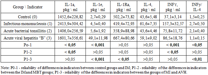 Thus, a comparative study of cytokines in clinically similar groups of patients requiring differential diagnostic search revealed significant differences in the level of indicators. At the height of the disease in the blood serum of sick children with Epstein-Barr infectious mononucleosis of viral etiology, an increase in the content of pro-inflammatory cytokines IL-1a (1.7 times), IL-β (1.6 times) and INF-y (4.3 times times). In a severe course of infectious mononucleosis, a twofold increase in the level of IL-1α and IL- β,7-fold increase in the concentration of INF-γ, increase in the content of IL-1Ra (2.3 times) in blood serum and the ratio INF-γ / IL-4 (1.6 times).Correlation relationships were also established between the levelsIL-1α and IL-1 Ra (0,49), IL-1 α and IL-4 (0,45), IL-1 α and INF- γ (0,64), INF- γ and IL-4 (0,47), INF-and γ the number of atypical mononuclear cells (0,37). Acute bacterial tonsillitis is characterized by a 2-fold increase in levels IL-1e and INF γ -, and acute viral hepatitis "B" - by an order of magnitude more significant increase in the concentration of IL- β (18 times), increased INF-γ (2.3 times) and an increase in the level of IL-1 Ra (1.3 times).
