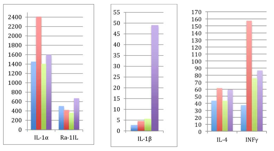 Content researchof IL-1α, IL-1β, IL-1Ra, IL-4, INF-γconducted in children of patients with infectious Epstein-Barr mononucleosis of viral etiology, acute bacterial tonsillitis, acute viral hepatitis "B" and relatively healthy children.Evaluation of the content of cytokines in the group of patients diagnosed with Epstein-Barr infectious mononucleosis of viral etiology revealed a significant increase in serum levels of pro-inflammatory cytokines, while the content of anti-inflammatory IL-1Ra and IL-4 did not differ from those in the group of clinically healthy children (Table 1, Fig. 1). So, the content of IL-1α and IL-β exceeded the results of the group of healthy donors by 1.7 and 1.6 times, respectively, and the level of content INF-γ exceeded the indicators of the control group by 4.3 times(p<0,05). Coefficientof INF-IL-4was 2,7±0,50 (р<0,05), which is 1.3 times higher than in patients with acute bacterial tonsillitis and 2.5 times in patients with acute viral hepatitis "B".Table 1. The level of cytokines in patients with Epstein-Barr infectious mononucleosis of viral etiology and in the comparison groups  |