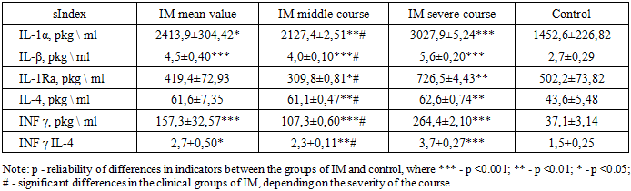 In sick children diagnosed with acute bacterial tonsillitis, the level of IL-1α and IL-4 did not differ significantly from the values of the group of healthy children, IL-1Ratended to decrease, whereas the concentration of IL-β, INF-γ 2 times higher than the indicators of the group of healthy children (p<0,05). Coefficientof INF- γ, IL-4 was 2,1±0,40, not significantly different from the indicator in patients with infectious mononucleosis.In acute viral hepatitis B, attention is drawn to a sharp increase in the contentIL-β, 18 times relative to the group of clinically healthy children (table 1, figure 1). Also, a characteristic feature of AVH "B" is an increase in the level of IL-1Ra (1.3 times), which may serve as a differential difference of this disease. Along with this, an increase in the content INF- γ (2.3 times relative to control), while the content IL-1α and IL-4 was within the indices of the group of healthy donors with a slight tendency to increase. CoefficientINF- γ IL-4 significantly lower than the value in the MI group and was 1,14±0,15 (р<0,01).When analyzing the results obtained, significant intergroup differences were found, which made it possible to determine diagnostically significant cytokine markers of the studied infections in sick children. Thus, a distinctive feature of Epstein-Barr infectious mononucleosis of viral etiology in sick children is a significant increase in the content of IL-1α (1.7 times compared to a group of clinically healthy children) at a normal level of its content in patients with acute bacterial tonsillitis and acute viral hepatitis "B », IL-β (1.6 times) and the maximum increase in INF-γ - (4.3 times). The differential diagnostic criterion for acute viral hepatitis is a significant increase in the level of IL-β (18 times relative to the group of healthy children), INF γ - (2.3 times) and IL-1Ra (1.3 times), and a feature of acute bacterial tonsillitis in adults can be considered a twofold increase in the level of IL-β and INF-γ relative to the group of clinically healthy children.With obvious intergroup differences in the serum concentration of cytokines in the patients of the three clinical groups, there is a similar pattern of changes in the indicated cytokine profile, as evidenced by an increase in the content of proinflammatory INF-γ, which is most pronounced in MI, as well as the absence of changes in the anti-inflammatory cytokine - IL-4. The INF-γ, IL-4 coefficient in MI was significantly different from the AVH "B" groups (p<0.01) and healthy donors (p<0.05).When studying the concentration of cytokines, a significant change in the level of all studied parameters was determined depending on the severity forms of Epstein-Barr infectious mononucleosis of viral etiology.The level of the studied pro- and anti-inflammatory cytokines in moderate MI was slightly lower than the average values in the general group of infectious mononucleosis, but with the preservation of the direction of changes. Severe MI was characterized by a twofold increase in the level of IL-1α and IL-β,7-fold increase in the concentration of INF-γ, an increase in the content of IL-1Ra in the blood serum and the coefficient INF-γ IL-4 (table 2).Table 2. Cytokine levels depending on the severity of infectious mononucleosis  |