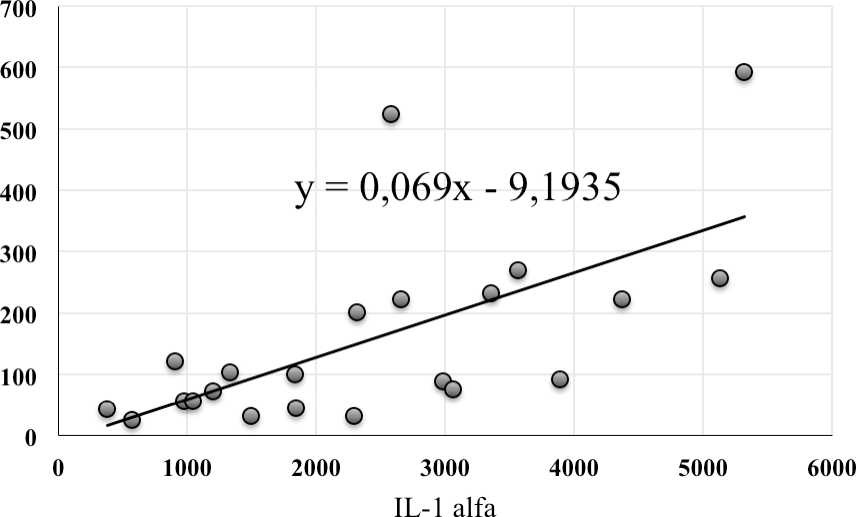 When researching the correlations between the levels of cytokines, the content of atypical mononuclear cells in peripheral blood and the level of aminotransferases (ALT, AST), the following relationships were established: a moderate direct correlation between the levels IL-1 and ILα-1Ra (0,49), IL-4 (0,45); more pronounced correlation is observed between levelsIL-1α and INF-γ - 0,64 (Fig 2); level INF- γ also correlates with the levelIL-4 (0,47)and the number of atypical mononuclear cells (0.37); the level of aminotransferases does not correlate with the level of any of the cytokines. | Figure 2. Correlation between the level of INF-γ and IL-1α in the acute period of infectious mononucleosis |