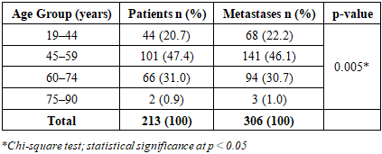 The study cohort comprised 213 patients with metastatic breast cancer. A cumulative total of 306 metastatic foci were identified, indicating that multiple organ involvement was common (mean: 1.44 metastatic sites per patient). Age-stratified analysis revealed significant differences in metastatic distribution among age groups (χ² = 12.84, p = 0.005). The highest metastatic burden was observed in women aged 45–59 years, comprising 101 patients (47.4%) with 141 metastatic foci (46.1%). Detailed age distribution is presented in Table 1.Table 1. Distribution of Patients and Metastases by Age Group  |