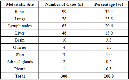 Analysis of metastatic site distribution revealed predominant involvement of the skeletal system (n=99, 32.4%), followed by lungs (n=78, 25.5%), lymph nodes (n=63, 20.6%), and liver (n=46, 15.0%). Less frequent metastatic sites included the brain (n=10, 3.3%), ovaries (n=4, 1.3%), skin (n=3, 1.0%), adrenal glands (n=2, 0.6%), and pleura (n=1, 0.3%). Detailed distribution is presented in Table 2.Table 2. Distribution of Metastases by Anatomical Site  |