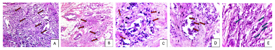 Histopathological examination of metastatic foci revealed invasive ductal carcinoma as the predominant subtype (n=168, 78.9%), followed by invasive lobular carcinoma (n=30, 14.1%). Less common histological variants included mucinous carcinoma (n=8, 3.8%), tubular carcinoma (n=4, 1.9%), and micropapillary carcinoma (n=3, 1.4%).Invasive ductal carcinomas demonstrated characteristic morphological features including partial preservation of cribriform and ductal architectural elements, prominent desmoplastic stromal reaction, and variable lymphoid infiltration. Tumor cells exhibited enlarged hyperchromatic nuclei with irregular contours and increased nuclear-to-cytoplasmic ratio. Invasive lobular carcinomas displayed distinctive features including loss of intercellular adhesion (attributed to E-cadherin dysfunction), single-file (Indian file) growth pattern, and stromal fibrosis with collagenization (Figure 1). | Figure 1. Histopathological features of breast carcinoma. (A) Invasive lobular carcinoma demonstrating characteristic single-file growth pattern (arrows). H&E, ×20. (B) Invasive ductal carcinoma with desmoplastic stromal reaction (arrows). H&E, ×40. (C) Cellular architecture showing nuclear pleomorphism (arrows). H&E, ×100. (D) High-power view demonstrating cellular atypia with enlarged hyperchromatic nuclei (arrows). H&E, ×100. (E) Poorly differentiated carcinoma with increased mitotic activity (arrows). H&E, ×100 |