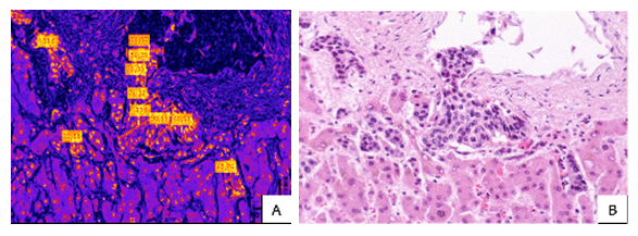 Morphometric analysis using Fiji ImageJ software revealed significant variation in cell dimensions between metastatic sites. In lymph node metastases, cell and nuclear diameters ranged from 19.8 to 68.6 μm (mean: 42.3 ± 12.7 μm). Hepatic metastases demonstrated larger cellular dimensions, ranging from 20.0 to 132.8 μm (mean: 58.4 ± 28.9 μm), suggesting greater cellular pleomorphism in visceral metastases (Figure 2). | Figure 2. Hepatic metastasis of invasive lobular breast carcinoma. A: Morphometric analysis using Fiji ImageJ software demonstrating cellular structure measurements ranging from 20.0 to 132.8 μm. Bzz: Histopathological examination showing tumor cells with characteristic loss of intercellular adhesion and single-file arrangement pattern, consistent with lobular carcinoma morphology. H&E staining |