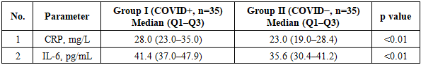 This comparative study included 70 patients diagnosed with rheumatoid arthritis (RA) according to the 2010 ACR/EULAR classification criteria. All participants underwent clinical examination and follow-up at (institution name, city, country to be inserted). The study was approved by the Local Ethics Committee, and written informed consent was obtained from all participants prior to enrollment.Patients were stratified into two groups based on their COVID-19 history: Group I (COVID+) consisted of RA patients with confirmed COVID-19 within the preceding 6 months (n=35), whereas Group II (COVID−) included RA patients without a history of COVID-19 (n=35). The groups were comparable with respect to age, sex, disease duration, and clinical-radiological stage.Inclusion and Exclusion CriteriaInclusion criteria were: (1) diagnosis of RA according to the 2010 ACR/EULAR criteria; and (2) age ≥18 years. At the time of assessment, participants were required to have clinically active RA manifestations. For Group I, confirmation of COVID-19 within the past 6 months was required and was based on at least one of the following: PCR or rapid antigen testing, chest computed tomography findings, medical documentation, or physician-confirmed diagnosis.Exclusion criteria included: presence of other systemic autoimmune diseases, acute infections at the time of evaluation, malignancy, severe decompensated comorbid conditions, or refusal to participate in the study.Clinical AssessmentRA disease activity was assessed using the Disease Activity Score in 28 joints (DAS28). Pain intensity was evaluated using a 100-mm Visual Analog Scale (VAS; 0–100 mm). Functional status was assessed with the Health Assessment Questionnaire (HAQ; score range 0–3), and health-related quality of life was evaluated using the Short Form-36 (SF-36) questionnaire. In addition, the Ritchie Articular Index was calculated as a clinical measure of joint tenderness.Laboratory MeasurementsSerum C-reactive protein (CRP) was measured as a marker of systemic inflammation. Serum IL-6 concentration was determined using enzyme-linked immunosorbent assay (ELISA). Blood samples were collected in the morning after an overnight fast, centrifuged, and the separated serum was stored under standard conditions until analysis.Statistical AnalysisStatistical analyses were performed using (Statistica/SPSS/Microsoft Excel; specify software and version if available). Non-normally distributed variables are presented as median (Me) and interquartile range (Q1; Q3). Between-group comparisons were conducted using the Mann–Whitney U test. Associations between IL-6 and CRP, DAS28, and VAS were evaluated using Spearman’s rank correlation coefficient. A p-value <0.05 was considered statistically significant, while p<0.01 indicated high statistical significance.