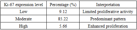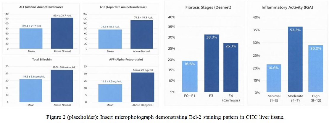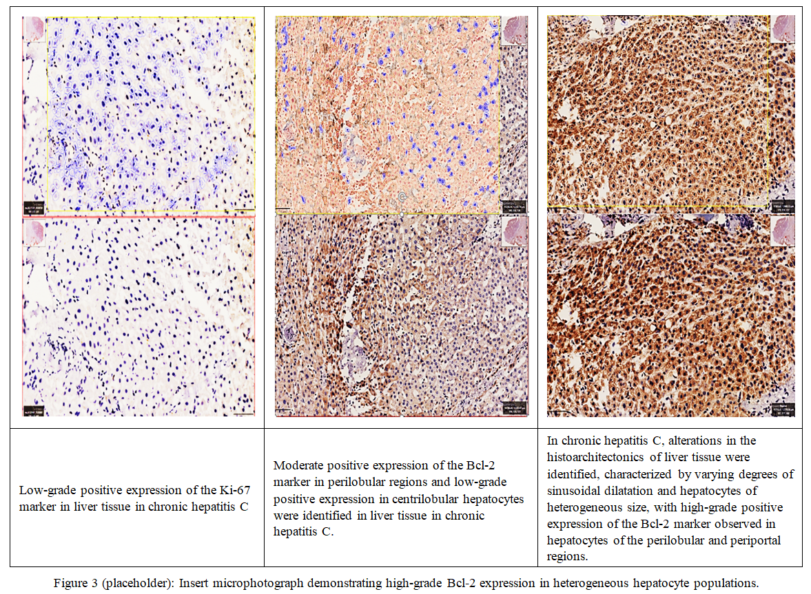 Inflammatory activity assessed by the IGA score was categorized as minimal (1–3 points), moderate (4–7 points), and high (8–12 points). Patients with high activity more frequently exhibited periportal interface hepatitis, multifocal lobular necrosis, and dense lymphoplasmacytic infiltration in portal tracts. A moderate positive correlation was observed between fibrosis stage and IGA score (r=0.61, p<0.05), indicating that increased necroinflammation is associated with accelerated fibrogenesis [3,4,23].Parenchymal and sinusoidal alterations included granular and hydropic degeneration of hepatocytes, as well as steatosis (predominantly microvesicular, with macrovesicular patterns in a subset). Sinusoidal dilatation, endothelial swelling, and erythrocyte aggregation were observed. Kupffer cells showed hyperplasia and increased cytoplasmic volume, with clustering in more active cases. Morphometry indicated higher Kupffer cell density in advanced fibrosis groups (F3–F4) compared with early stages (F0–F1) (p<0.05) [7,8,22].Table 2. Semi-quantitative distribution of Ki‑67 immunoexpression in CHC liver biopsies (subset, n=20)  |