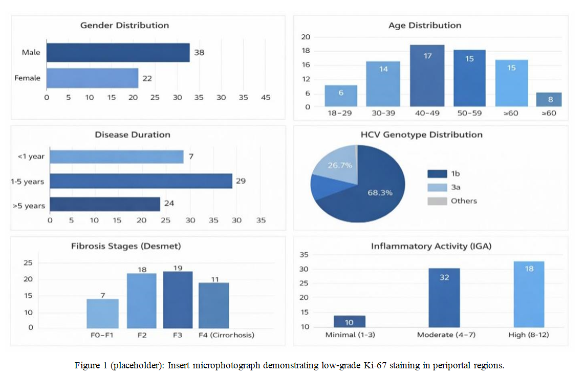 Study design: Retrospective cohort analysis of liver biopsy specimens. Patients: Sixty adult patients (age ≥18 years) with serologically confirmed hepatitis C (anti‑HCV positive and HCV RNA positive) were included. Exclusion criteria were other etiologies of hepatitis (HBV/HDV, autoimmune hepatitis), alcohol-related or drug-induced liver disease.Clinical data: Age, sex, duration of disease, biochemical parameters (ALT, AST, bilirubin), and scoring systems (Child–Pugh, MELD when available) were extracted from medical records.Histology: Biopsy specimens were fixed in formalin, paraffin-embedded, sectioned, and stained with hematoxylin–eosin; additional stains were used as required. Fibrosis was scored as F0–F4, and inflammatory activity was evaluated with an IGA score considering portal, periportal, and lobular infiltration [4,6,24]. Steatosis (microvesicular/macrovesicular; focal/diffuse) and cholestasis were assessed semi‑quantitatively.Immunohistochemistry: IHC was performed in 20 cases using Ki‑67 (proliferation marker) and SMA (stellate cell/myofibroblast activation). Staining intensity and proportion of positive cells were graded (0–3 points). Kupffer cell activity was additionally evaluated morphometrically.Morphometry: A 100‑point ocular grid at ×600 magnification was used; 20 high‑power fields were analyzed per specimen.Statistics: Student’s t‑test and Pearson correlation were applied; p<0.05 was considered significant.