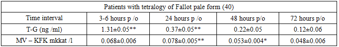 In patients without clinical and instrumental signs of heart failure, tetralogy of Fallot was presented by a pale form, mild dextroposition of the aorta and mild infundibular hypertrophy of the right ventricle and moderately significant stenosis of the pulmonary arteries without hypoplasia of the fibrous ring.Patients with signs of heart failure in the postoperative period included those with tetralogy of Fallot with pronounced anatomical and morphological changes, i.e., pronounced infundibular stenosis of the right ventricle, pronounced fibrous hypoplasia rings with Z - score values of - 2; - 3; pronounced dextraposition of the aorta (n=21), as well as with combined defects, tetralogy of Fallot + atrioventricular communication full form. The above mentioned signs were identified in as a result of the conducted Echocardiography and MSCT studies.Radical correction of tetralogy of Fallot was performed using the standard method in 40 patients and the remaining 21 patients underwent radical correction of tetralogy of Fallot using the transannular method plastics with expansion of the hypoplastic fibrous ring and pulmonary trunk arteries with formation of the third neovalves (Table 1; Table 2).Table 1. Laboratory parameters in patients with tetralogy of Fallot without hypoplasia of the cervical canal  |