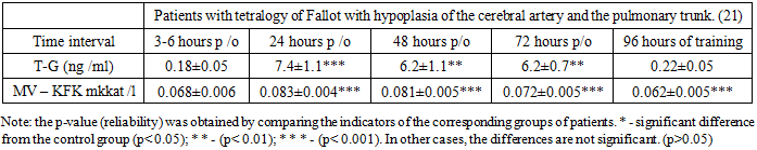 The current stage of development of pediatric cardiac surgery is characterized by the active use of surgical methods for eliminating congenital heart defects, especially complex, multicomponent forms, which is a tetrad Fallot's tetralogy is characterized by hypoplasia of the pulmonary artery fibrous ring, which brings to the forefront the issues of patient management in the postoperative period [1,3,5]. Even with successful surgical correction, functional disorders often persist in children, primarily manifested by signs of heart failure, as well as a spectrum of early postoperative complications [2,4]. Adaptation of the cardiovascular system to new hemodynamic conditions after radical correction of Fallot's tetralogy may be accompanied by decompensation of myocardial contractile function and the development of systemic and tissue homeostasis disorders [1,2,3,5]. In this regard, the study of biochemical markers of cardiac muscle damage, in particular the concentration of troponin-T (Tr -T) and the activity of the MB fraction of creatine phosphokinase (MB-CPK) in the blood serum, is of particular diagnostic value [4,6,7]. The level of these indicators reflects the extent of myocardial damage and can serve as a criterion for assessing the severity of postoperative changes. The combination of these factors necessitates analyzing these biochemical parameters in children with congenital heart defects during the perioperative period.Purpose of the study. To evaluate changes in biochemical markers depending on the severity of heart failure in patients with teradle of Fallot with hypoplasia of the fibrous pulmonary artery rings in the early stages after radical correction.