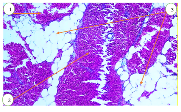 Figure 1. Microscopic appearance of the thymus of a 6-month-old outbred white rat following chronic exposure to carbon monoxide. Alcian blue staining. Objective 20×, ocular 10×. 1 – cortical zone; 2 – medullary zone; 3 – interlobular trabeculae