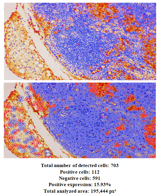 In 6-month-old rats, the mean area of the thymic lobule was 66.3 ± 0.9%. In the control group of 6-month-old rats, the mean area of the cortical region was 64.9 ± 1.3%, the mean area of the medullary region was 25.4 ± 1.6%, and the corticomedullary index was 2.4 ± 0.1%.