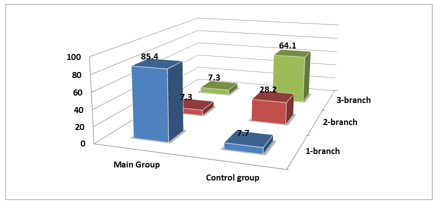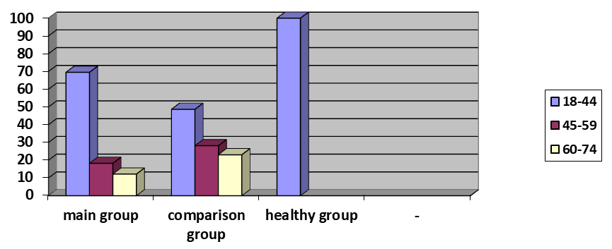 The average age of the patients participating in the study in the main, comparison, and control groups was 39.5±1.6, 47.2±2.7, and 27.8±1.2 years, respectively (p<0.05) (Fig. 1). | Figure 1. Distribution of Patients by Age Groups (%) |