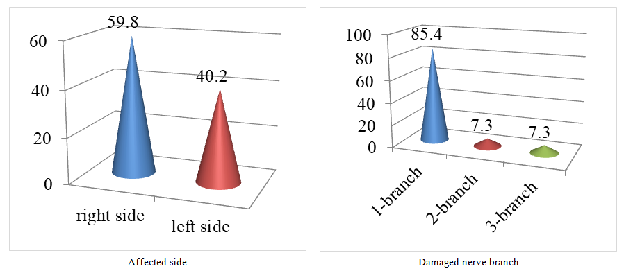 Women predominated among the patients in all three groups. The proportion of men was 26.8% in the main group, 20.5% in the comparison group, and 47.6% in the healthy group, with no statistically significant differences between the groups identified.The results showed that in the main group with trigeminal neuralgia in comorbid herpes infection, 59.8% of patients had pain predominantly on the right side of the face, while 40.2% of patients had pain on the left side. In the comparison group with trigeminal neuralgia, the situation was opposite: 41% of patients had pain on the right side, and 59% had pain on the left side of the face. Thus, it can be concluded that in patients with trigeminal neuralgia in comorbid herpes infection, pain is most often localized on the right side of the face.The localization of pain in specific areas of the face plays an important role in the correct diagnosis of the disease and the choice of appropriate treatment tactics. Therefore, in our study, we analyzed in which specific areas of the face the pain is observed. It turned out that in patients with trigeminal neuralgia in comorbid herpes infection, the pain was predominantly localized in the forehead and upper part of the face (86.6%), with the eye area being the second most common (36.6%). Furthermore, 37.8% of patients had pain in two or more areas of the face simultaneously.In patients from the comparison group with trigeminal neuralgia, unlike the main group, pain was most often observed in the area of the lower jaw and ear (59.0%), as well as the upper jaw (41.0%). Thus, it can be concluded that in patients with trigeminal neuralgia in comorbid herpes infection, pain is predominantly localized in the forehead, upper face, and eye areas.Analysis of patient complaints revealed factors that increase pain, which were studied and assessed. In the main group, these factors were: washing the face (62.2%), touch of clothing or a pillow (47.6%), exposure to wind (78%), as well as the influence of two or more factors simultaneously (87.8%). In the comparison group, these figures were 56.4%, 59%, 61.5%, and 56.4%, respectively. However, a statistically significant difference (p<0.001) was found only among patients who were affected by two or more factors.In all patients from the main and control groups, the exit point of the trigeminal nerve (Valleix's points) was painful. Upon analysis of which specific branch of the fifth cranial nerve was damaged, it turned out that in the majority of patients in the main group, the first branch was damaged, while in patients in the control group, the third branch was damaged (p<0.001) (Fig. 2).  | Figure 2. Distribution of Patients by Damage to the V Pair of Nerve Branches (%) |
