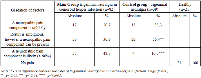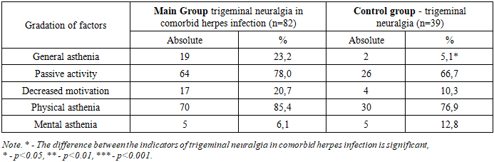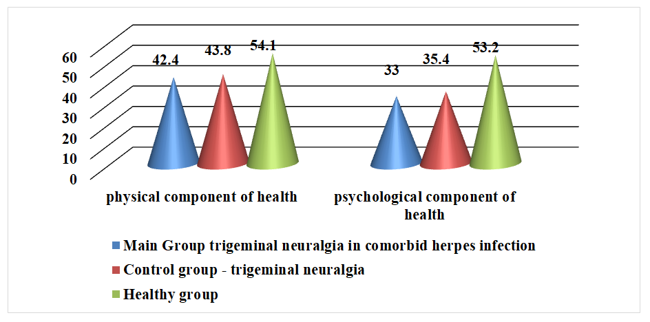 The main group included 82 patients with positive results for HSV IgG types 1 and 2, CMV IgG by ELISA, with comorbid herpes infection trigeminal neuralgia. The comparison group consisted of 39 patients with trigeminal neuralgia of other etiologies and 21 healthy individuals.Clinical indicators of patients, pain intensity, quality of life, results of laboratory tests. To assess the neuropathic nature of pain, the Pain Detect and DN4 scales were used. The Hamilton scale was used to assess anxiety. For the subjective assessment of asthenia, the MFI-20 scale was used, and for quality of life, the SF-36 questionnaire. The obtained results were subjected to statistical processing, including the calculation of average relative values and their errors. Student's t-test and the chi-square test were used to assess differences between groups and their significance.