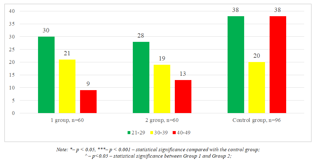 Considering that the study targeted women aged 21 to 49 years according to regulatory documents of the Republic of Uzbekistan, all examined patients were conditionally divided into three age groups (21–29, 30–39, and 40–49 years). The mean age of women included in the analysis was 28.3 ± 6.35 years (Figure 1). | Figure 1. Age characteristics of the examined women |
