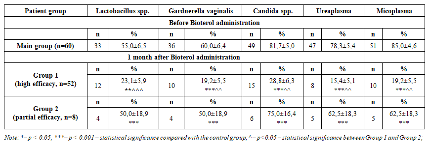 In the main group (n=60) before Bioterol administration, a high frequency of pathogenic flora characteristic of dysbiosis was detected in the vaginal microbiocenosis: Gardnerella vaginalis – 36 (60.0 ± 6.4%), Candida spp. – 49 (81.7 ± 5.0%), Ureaplasma – 47 (78.3 ± 5.4%), Mycoplasma – 51 (85.0 ± 4.6%). At the same time, the level of Lactobacillus spp., representing normal and protective flora, was low – 33 (55.0 ± 6.5%).One month after administration of Bioterol, in Group 1 (high efficacy, n=52), the pathogenic flora decreased significantly: Gardnerella vaginalis – 10 (19.2 ± 5.5%), Candida spp. – 15 (28.8 ± 6.3%), Ureaplasma – 8 (15.4 ± 5.1%), Mycoplasma – 10 (19.2 ± 5.5%). These values were 3–5 times lower compared to baseline, p < 0.001.Although Lactobacillus spp. decreased from 33 (55.0%) to 12 (23.1 ± 5.9%), this was associated with reduced inflammation and elimination of pathogenic flora. Recovery of normal microbiota was expected in the following months, p < 0.05.In Group 2 (partial efficacy, n=8), the reduction of pathogenic flora was insufficient: Gardnerella vaginalis and Lactobacillus spp. – 4 (50.0 ± 18.9%), Candida spp. – 6 (75.0 ± 16.4%), Ureaplasma and Mycoplasma – 5 (62.5 ± 18.3%). These findings indicate the need for an additional course or adjustment of treatment strategy to achieve full efficacy of Bioterol, p < 0.05.Additionally, analysis of triple-site smears showed that before Bioterol administration, the main group (n=60) had high levels of inflammation and pathogenic flora:• Leukocytes: vagina – 56 (93.3 ± 3.2%), cervix – 56 (93.3 ± 3.2%), urethra – 56 (93.3 ± 3.2%)• Epithelial cells: vagina – 48 (80.0 ± 5.2%), cervix – 44 (73.3 ± 5.8%), urethra – 50 (83.3 ± 4.9%)• Mucus: vagina – 42 (70.0 ± 5.9%), cervix – 48 (80.0 ± 5.2%), urethra – 54 (90.0 ± 3.9%)• Fungi: vagina – 55 (91.7 ± 3.6%), cervix – 48 (80.0 ± 5.2%), urethra – 46 (76.7 ± 5.5%)• Trichomonads: vagina – 16 (26.7 ± 5.8%), cervix – 18 (30.0 ± 5.9%), urethra – 3 (5.0 ± 2.8%)One month after administration, in Group 1, inflammation decreased sharply:• Leukocytes: vagina – 11 (21.1 ± 5.7%), cervix – 5 (9.6 ± 4.1%), urethra – 13 (25.0 ± 6.1%), p < 0.001• Epithelial cells and mucus: decreased 3–4 times, vagina – 14 (26.9 ± 5.2%), mucus – 9 (17.3 ± 5.3%)• Fungi: vagina – 15 (28.8 ± 6.3%), cervix – 16 (30.8 ± 6.5%), urethra – 11 (21.1 ± 5.7%)• Trichomonads: decreased nearly 3 times, vagina – 6 (11.5 ± 4.5%), cervix – 4 (7.7 ± 3.7%), urethra – 2 (3.8 ± 7.2%), p < 0.001In Group 2 (n=8), some positive dynamics were also observed:• Leukocytes: vagina – 4 (50.0 ± 18.9%), cervix – 3 (37.5 ± 18.3%), urethra – 5 (62.5 ± 18.3%)• Epithelial cells and mucus: decreased by 25–62%• Fungi: remained high – vagina 7 (87.5 ± 12.5%), cervix 6 (75.0 ± 16.4%), urethra 5 (62.5 ± 18.3%)• Trichomonads: did not exceed 1–2 casesThus, Bioterol reduced signs of inflammation by 3–5 times and pathogenic flora by 3–7 times, and the differences between groups were statistically significant, p = 0.001–0.05.Comparative bacteriological culture analysis of vaginal flora before and after Bioterol administration showed that, prior to treatment, the main group exhibited significant dysbiosis:• Streptococci: 38 (63.3 ± 6.3%)• Enterococci: 42 (70.0 ± 5.9%)• Staphylococci: 32 (53.3 ± 6.5%)• Enterobacteriaceae: 35 (58.3 ± 6.4%)• Candida: 55 (91.7 ± 3.6%). (Table 2). | Table 2. Comparative description of vaginal bacteriological culture analysis before and after Bioterol administration (M±m), % |
