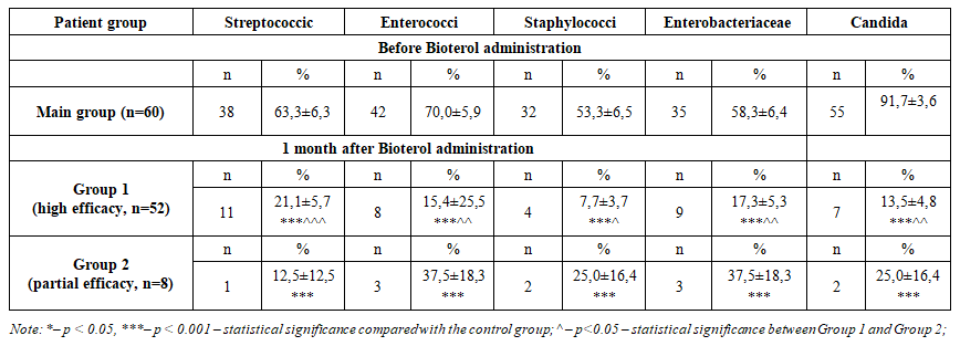 One month after administration of the preparation, a marked positive change in microbiological parameters was observed. In Group 1 (high efficacy, n=52) of the main group, the frequency of microorganisms decreased as follows: Streptococci – 11 (21.1 ± 5.7%), Enterococci – 8 (15.4 ± 5.5%), Staphylococci – 4 (7.7 ± 3.7%), Enterobacteriaceae– 9 (17.3 ± 5.3%), and Candida – 7 (13.5 ± 4.8%), p < 0.001.In Group 2 (partial efficacy, n=8), a significant reduction in microbial frequency was also observed: Streptococci – 1 (12.5 ± 12.5%), Enterococci – 3 (37.5 ± 18.3%), Staphylococci – 2 (25.0 ± 16.4%), Enterobacteriaceae – 3 (37.5 ± 18.3%), and Candida – 2 (25.0 ± 16.4%), p < 0.05–0.01.Overall analysis indicated that Bioterol reduced pathogenic flora in the vaginal microbiocenosis by 3–7 times, with statistically significant differences for all parameters, p < 0.001.