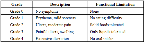 OM progresses through well-defined stages—from erythema to ulceration and healing—usually 5–14 days after chemotherapy initiation [1].Table 1. WHO Clinical Staging of Oral Mucositis  |