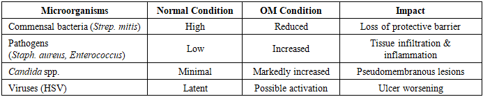 Key findings in OM microbiology:• Candida albicans colonization increases 5–7 folds [4].• Pathogenic bacteria dominate ulcer surfaces.• Dysbiosis amplifies cytokine activity (TNF-α, IL-6), worsening tissue injury [5].