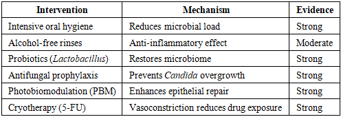 OM prevention is most effective when applied BEFORE and DURING chemotherapy. Recommended modalities include:Table 3. Evidence-Based OM Prevention Protocol  |