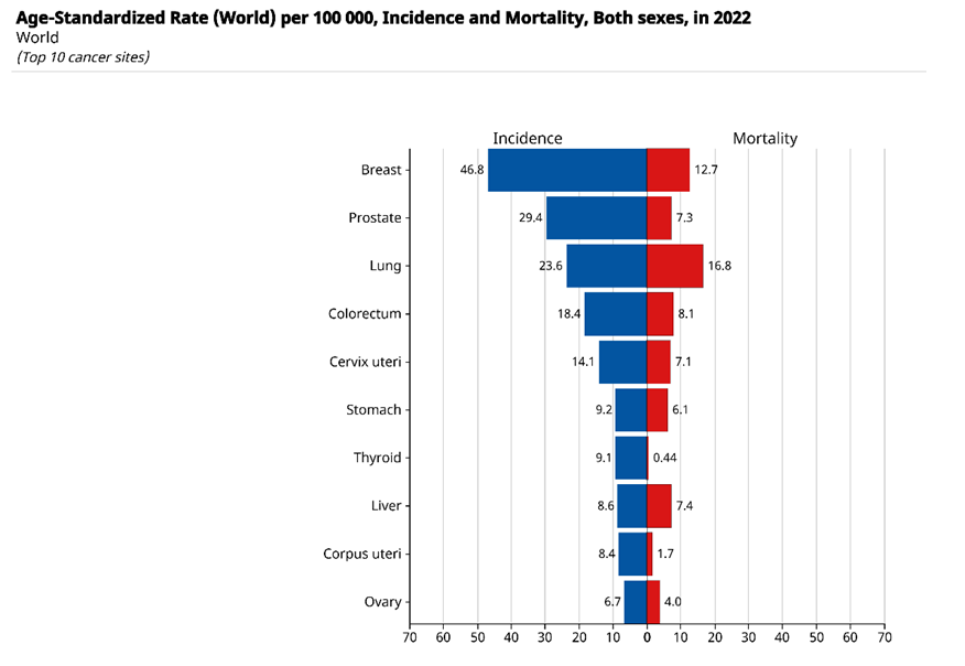 Rectal cancer, which is part of the group of colorectal malignancies, remains one of the leading causes of cancer incidence and mortality worldwide. According to GLOBOCAN 2020 estimates, rectal tumors account for a significant proportion of colorectal cancer cases and related deaths, highlighting the clinical importance of optimizing locoregional therapy in patients with locally advanced disease [6].Figure 1 shows the age-standardized incidence and mortality rates for the top 10 cancer sites worldwide (2022). For the combined category “colorectum,” the incidence rate was 18.4 per 100,000 and the mortality rate was 8.1 per 100,000 — a mortality-to-incidence ratio of approximately 0.44, reflecting moderate lethality compared to, for example, lung cancer, which has high mortality despite lower incidence. | Figure 1. Age-standardized incidence and mortality rates (per 100,000 population, both sexes), 2022 – Top 10 cancer sites (GLOBOCAN 2022) |