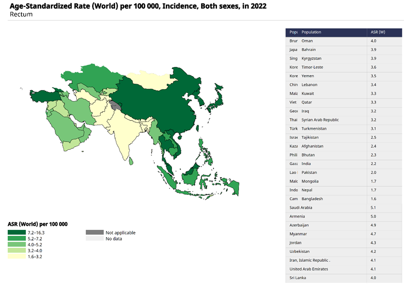Figure 2 demonstrates the territorial variability of rectal cancer incidence in the Asia and Middle East region: higher rates are observed in several countries of Central Asia and the Middle East (dark green areas), while relatively low ASR values are registered in South Asia and parts of Southeast Asia. The table on the right highlights countries with the highest rates in the region (including Uzbekistan — approximately 4.2 per 100,000 according to the given data), reflecting a combination of factors: differences in the prevalence of risk factors (diet high in animal fat and low in fiber, obesity, sedentary lifestyle), availability and coverage of screening programs, quality of registration and diagnosis, as well as demographic and genetic characteristics of populations. | Figure 2. Age-standardized incidence rate of rectal cancer (ASR, per 100,000 population, both sexes), map of prevalence by countries in the region (GLOBOCAN 2022) |