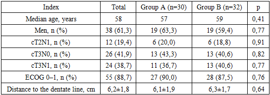 The study included 62 patients with locally advanced rectal cancer, divided into two groups: Group A consisted of 30 patients who received neoadjuvant chemotherapy according to the FOLFOX regimen with selective chemoradiotherapy in cases of insufficient response; Group B included 32 patients who underwent standard preoperative chemoradiotherapy. The median age was 58 years (57 years in Group A and 59 years in Group B), with no significant differences between cohorts (p=0.41) (Table 1). Males comprised the majority (61.3%), with comparable distribution in both groups (63.3% vs. 59.4%; p=0.77). Clinically, tumors of category cT3N0 (41.9%) and cT3N1 (38.7%) predominated; patients with stage cT2N1 accounted for 19.4%, with no statistically significant differences between groups (p>0.7). Functional status according to the ECOG scale was 0–1 in 88.7% of patients (90.0% in Group A and 87.5% in Group B; p=0.76), indicating high baseline therapy tolerance. The mean distance from the lower tumor pole to the dentate line was 6.2±1.8 cm (6.1±1.9 cm and 6.3±1.7 cm, respectively; p=0.64), reflecting predominantly mid- and low-ampullary tumor localization. Thus, the study groups were homogeneous in terms of age and sex characteristics, clinical stage, functional status, and anatomical tumor features, ensuring the validity of the subsequent comparative analysis of radiotherapy and surgical treatment outcomes.Table 1. Patient Characteristics (n=62)  |