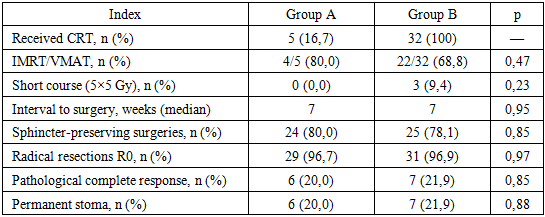 Both study groups showed comparable treatment and surgical outcomes. In Group A, chemoradiotherapy was required in only 5 (16.7%) patients, whereas in Group B, all 32 (100%) patients received it, consistent with the study design and confirming the possibility of selective radiation use with an adequate response to chemotherapy (Table 2). Among patients who underwent radiation therapy, modern conformal techniques IMRT/VMAT were predominantly used in both groups (80.0% in Group A and 68.8% in Group B; p=0.47), providing optimal isodose distribution and reducing the risk of late toxicity. Short-course radiation (5×5 Gy) was used sparingly—only in 3 (9.4%) patients in Group B, reflecting an individualized approach when accelerated surgery was necessary.Table 2. Treatment and Surgical Outcomes (n=62)  |