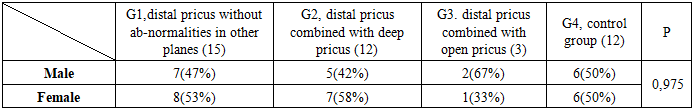 We conducted a comparative analysis of orthodontic treatment involving 42 patients aged 6 to 12 years with distal occlusion of the dentition and class 2 anomalies in mixed dentition. These patients sought treatment at the multidisciplinary clinic of the Tashkent Medical Academy between 2023 and 2024. The patients were categorized into 4 groups:• Group: Patients with distal occlusion but without malocclusion in other planes (15 patients).• Group: Patients with distal occlusion combined with deep bite (12 patients).• Group: Patients with distal occlusion combined with open bite (3 patients).• Control group: Consisting of 12 patients.Anthropometric examinations (according to Korhaus and Pon), X-ray examinations (teleroentgenography and orthopantomography), functional examination methods (Eshler-Bitner test) and statistical examination methods were used in the patients.The first group (I) included 15 patients with distal pricus without abnormalities in other planes. Their treatment was carried out with the help of a brace system calculated from traditional methods and with the help of functional apparatus Twin-block.The second group (II) included 12 patients with distal pricus combined with deep pricus. They were treated with a removable plate for the upper jaw with an inclined chewing surface and a brace system.The third group (III) included 3 patients with distal pricus combined with open pricus. In them, the treatment was carried out with the help of functional kappa-elastopositioners, i.e. the myobrace system and the brace system.The fourth group (IV) is the control group. 12 children between 6-12 years of age, aesthetically satisfactory, maxillofacial and dental-jaw systems, as well as soft tissue parameters and cephalometric parameters, were taken.According to statistics, gender ratios were studied in the obtained groups and the following results were obtained: Table 1. Comparability of groups by gender (chi-square test)  |