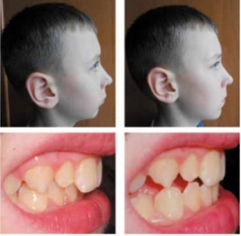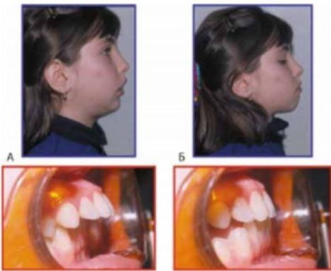 The X-ray method of the study included the study, generalization and analysis of 42 radiographs, of which 8 were orthopantomograms and 34 were teleroentgenograms.The study of orthopantomograms of the jaws included determining the number of teeth; the presence, location and shape of permanent tooth buds; the degree of formation of their roots; determination of identification of dental defects; determination of the shape of the vomer, inferior nasal concha; dentoalveolar height in various parts of the dentition; depth of incisal overlap; as well as studying the condition of the TMJ, which is important for treatment planning.In 4 patients studied, underdevelopment of the lower jaw was found due to early removal of primary teeth in the lower jaw.1 patient had 3.4 adentia; 4.4 teeth on the lower jaw. We studied 22 teleroentgenograms of the head in a lateral projection with a prognathic bite before treatment of the patient. For a comparative study, 12 lateral teleroentgenograms of the head of patients with orthognathic occlusion from the control group were used.The study compared the dimensions studied in distal and orthognathic bites with the data of the norm.When deciphering telerengenograms, excessive development of the body of the upper jaw in length was found in 12 patients and varied within 3-5 mm. The size of the body of the upper jaw within normal limits was observed in 10 individuals. Underdevelopment of the body of the lower jaw in length was found in 18 patients, which varied with a difference from 5 to 7 mm. The size of the body of the lower jaw was found within normal limits in 12 individuals. However, in 4 patients there was an increase of 3-5 mm in the length of the body of the lower jaw. This indicated that the size of the jaws is a genetically determined structure.The position of the lower jaw relative to the upper jaw was determined by measuring the angles MM and A-B-SPP. Normally, these angles should be 90°. The MM angle indicated the position of the basal arches, that is, the body of the lower jaw, and the A-B-SPP angle indicated the position of its dentoalveolar part. This made it possible to differentiate the skeletal form from the dentoalveolar one. In 18 patients, a retroposition of the lower jaw was observed, in particular, a retroposition of its body 4°-19° more than normal was found in 12 individuals, and of the dentoalveolar part - in almost all patients. Thus, in 15 patients the retroposition of the body and dentoalveolar part prevailed, and in 3 patients only the dentoalveolar part. In addition to the position of the upper and lower jaws in the skull, we paid great attention to the axial inclination of the teeth. Thus, protrusion of the upper incisors was found in 16 individuals and ranged from 5° to 17° less than normal (65°), which corresponded to class II, subclass 1 according to Engle. At the same time, retrusion of the upper incisors was also observed in 4 patients, which varied from 6° to 12°, which corresponded to class II, subclass 2 according to Engle. A diagnostic functional test was carried out in all patients we studied. To do this, the patient must close the teeth in the usual occlusion and remember the profile shape. Patients were then asked to move the mandible forward until the posterior teeth were neutral.In 60% of those studied, the facial profile improved when the lower jaw was shifted forward, which was due to underdevelopment of the lower jaw. (Sample No. 1).In 40% of those studied, the facial profile worsened when the lower jaw shifted forward, the reason for this being the excessive development of the upper jaw and its predominance over the lower jaw. (sample No. 2). | Figure 1. Carrying out the Eschler-Bittner test on a 12-year-old patient with a distal bite (test No. 1) |
