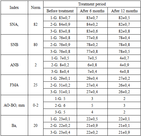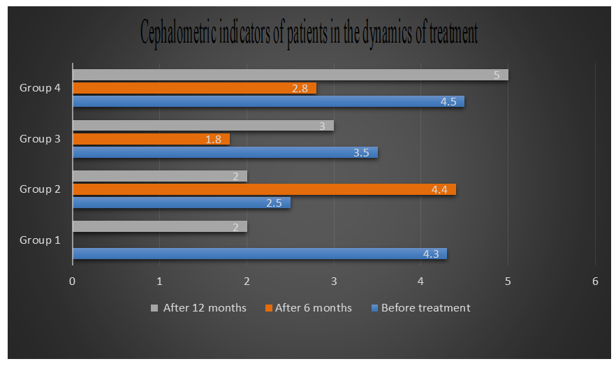Patients in group 1 were prescribed the Twin-block method, a contemporary approach for correcting this anomaly. The Twin-block, initially proposed by Clark and later modified, comprises two main components. Its primary active element is an expanding screw fitted onto the upper jaw. This device operates by encouraging the lower jaw to assume a corrective position. Being detachable, patients swiftly adapted to wearing them consistently, even during meals. This rapid adaptation resulted in fewer treatment interruptions and quicker achievement of positive outcomes. The constructive bite mechanism, which holds the lower jaw in a protruded position, also enhances facial aesthetics.Treatment proceeded in two stages: First, active treatment involved advancing the lower jaw while normalizing the occlusal relationship vertically. Second, maintaining correct incisor closure during the pre-eruption period of lateral teeth involved using a plate on the upper jaw with an anterior inclined biting platform and multiple clasps. The inclined bite platform extended to the distal areas, ending at the level of the distal surface of the lower jaw canines. To eliminate deep incisal overlap, occlusal pads were ground using an upper jaw apparatus for dentoalveolar lengthening at lower jaw molar areas. This grinding occurred a week after device fitting and patient adaptation. It gradually created free space on the lower jaw molars' chewing surfaces, approximately 1-2 mm, to prevent tongue displacement in the newly formed gaps.In cases of insufficient lower jaw growth rate or vertical jaw growth type, we monitored lower jaw advancement by adding self-hardening plastic layers on the inclined slopes of the upper jaw plate. As evident from the tables, distal occlusion occurrence in the observed children correlates with the distal position and/or delayed growth and development of the lower jaw. Bittner-Eschler tests yielded positive results in all 15 patients in the first group (100%), confirming the obtained cephalometric indicators and indicating the appropriateness of treatment with functional methods.In the 2-group of patients under study, plates were installed on their jaws. Because they had a distal anomaly combined with a deep pricus, the pricus height was raised with the help of plates and braces were worn.Children primarily wore the device during nighttime and for 2-3 hours in the afternoon, thereby naturally prolonging the treatment duration. Additionally, the bulkiness of the design, with its numerous components, often posed a challenge for patients. It's worth noting that in patients using the Frenkel function regulator, monitoring the posterior height of the lower face becomes challenging. As orthodontic treatment occurs during the child's active growth phase, the function regulator needs to be replaced several times throughout the treatment course, typically requiring the production of 2-3 devices.In the third group, the treatment of patients with distal anomalies combined with an open pricus was studied. Myobrace system - elastopositioners were used in them.The MYOBRACE (MBS) system is designed to condition the muscles of the maxillofacial area, aiding in the correction of teeth alignment. Unlike other elastopositioners, they feature high walls and indentations for both upper and lower dental arches, guiding emerging teeth during their eruption. The MYOBRACE (MBS) orthodontic appliance series is employed for treatment due to its versatility, eliminating the need for additional orthodontic appliances. Moreover, this system can serve as a pre-finisher with a retainer following braces removal, as well as for correcting various types of occlusal discrepancies.The obtained results can be compared in the following table (Table 3):Table 3. Cephalometric indicators of patients in the dynamics of treatment  |