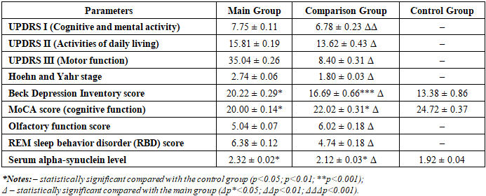 Parkinson’s disease (PD) is a progressive neurodegenerative disorder characterized by motor, cognitive, and neuropsychiatric impairments that significantly affect patients’ functional status and quality of life. Comprehensive clinical–neurological assessment remains essential for evaluating disease severity and identifying prognostic markers. A comparative clinical study was conducted involving patients with Parkinson’s disease divided into a main group and a comparison group, with an additional control group for selected parameters. Neurological, motor, cognitive, and psychoemotional status was assessed using the Unified Parkinson’s Disease Rating Scale (UPDRS I–III), Hoehn and Yahr staging, Montreal Cognitive Assessment (MoCA), Beck Depression Inventory, olfactory testing, REM sleep behavior disorder assessment, and serum alpha-synuclein levels. Statistical analysis included Student’s t-test and Pearson’s χ² test.