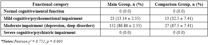 As presented in Table 1, the main group exhibited significantly higher UPDRS I–III scores and Hoehn and Yahr stages compared with the comparison group (p<0.05), indicating more severe cognitive, functional, and motor impairment. Beck Depression Inventory and MoCA scores differed significantly between groups, with greater depressive symptoms and cognitive decline in the main group. Serum alpha-synuclein levels were also significantly elevated in patients with more advanced clinical manifestations (p<0.05).Motor function assessment using UPDRS Part III revealed the most pronounced intergroup differences. Patients in the main group exhibited substantially higher motor impairment scores, reflecting severe bradykinesia, rigidity, postural instability, and gait disturbances. In contrast, motor symptoms in the comparison group were predominantly mild to moderate. [6,9] Functional categorization based on UPDRS III confirmed that severe motor dysfunction and significant limitation of independent movement were exclusive to the main group. These findings indicate that motor symptom severity remains a key determinant of disease burden and functional prognosis. To further characterize disease severity and functional impairment, patients in the main and comparison groups were stratified according to levels of cognitive, daily functional, and motor dysfunction based on UPDRS I–III scores. This functional categorization allowed for a more detailed comparison of impairment severity between groups and facilitated identification of clinically meaningful differences in baseline functional status. The distribution of patients across functional categories for each UPDRS domain is summarized in Table 2.Table 2. Comparative Analysis of Functional Status Based on UPDRS I–III Scores Before Treatment. UPDRS I – Cognitive and Psychoemotional Function  |