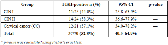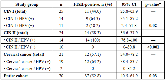 Cervical cancer (CC) is one of the most common malignancies of the female reproductive system, particularly prevalent in developing countries, mainly due to limited access to effective diagnostic tests [1].It is well known that HPV-associated cervical carcinogenesis is a multifactorial, progressive disease that usually passes through several stages of intraepithelial precancerous lesions of the cervix. In approximately 10% of cases, low-grade cervical intraepithelial neoplasia (CIN I) may progress to high-grade CIN (CIN II–III) and cervical cancer; therefore, early identification of cases with potential malignant and premalignant progression is critically important.Cytological screening programs are widely used for the diagnosis of cervical cancer. Cytological examination of cervical epithelial cells (Pap smears, liquid-based cytology) allows detection of early dysplastic changes, making it possible to implement preventive measures against malignant transformation. However, several studies have demonstrated that up to 50% of precancerous cervical lesions may be missed due to false-negative Pap test results [2,3]. Moreover, cytological examination does not assess the risk of disease progression or clearance of HPV infection leading to regression of pathological changes.In this context, molecular genetic methods, including FISH, are of particular interest, as they enable detection of early structural genomic alterations and provide biologically grounded risk stratification for CIN progression in clinical practice [4,5].Carcinogenesis is known to be driven by genetic modifications. Alterations in proto-oncogenes or tumor suppressor genes lead to changes in gene expression and, consequently, in the levels of functionally active protein molecules. These genetic disturbances ultimately result in impaired differentiation and maturation of cervical squamous epithelial cells, loss of cell cycle control, and the development of uncontrolled cellular proliferation [6–8].To date, a number of genes exhibiting different expression levels in normal epithelium, intraepithelial dysplasia of varying severity, and invasive cervical cancer have been identified. Thus, M. Del Pino et al. demonstrated a relationship between the expression level of the Cyclin-dependent kinase inhibitor 2A gene (CDKN2A, p16) and the severity of cervical lesions, with method sensitivity reaching 81% in HSIL (CIN III) [9]. Among genetic alterations detected in epithelial cells in cervical dysplasia and cervical cancer, the key role of the chromosomal region 9p21.3, where the CDKN2A (p16) gene is located, has been confirmed [10].The p16 gene product is involved in cell cycle regulation by inducing arrest at the G1 and G2/M checkpoints and acts as a negative regulator of cell proliferation [11,12]. Genetic alterations of p16 result in reduced CDKN2A protein expression. In neoplastic processes, p16 inactivation may be caused by promoter methylation, point mutations, or homozygous deletion [13].One of the methods for detecting genetic alterations associated with cervical epithelial cell transformation is fluorescence in situ hybridization (FISH), performed on cytological or histological specimens. FISH analysis using locus-specific DNA probes allows identification of gene rearrangements, as well as deletions and amplifications of chromosomal regions containing clinically significant markers, including 9p21.3 (p16) and 17p13.1 (TP53).At the same time, assessment of p16, TP53, ATM, and other molecular markers of cervical neoplasia development is associated with several limitations due to tumor tissue heterogeneity, the need for invasive biopsy, and differences in sensitivity and specificity of the applied methods [13,14]. Therefore, there remains a need for diagnostic approaches that combine high accuracy with practical applicability in clinical settings.Aim of the StudyTo evaluate the capabilities of the FISH method in detecting early genetic rearrangements of the cervical epithelium and their clinical significance in CIN progression.