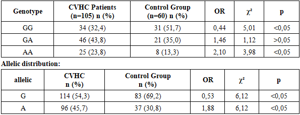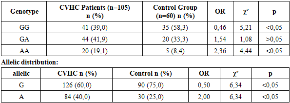 This table presents the genotype distribution of the IL-10 (−1082 G/A) gene polymorphism in patients with chronic viral hepatitis C (n=105) and in a healthy control group (n=60). In the patient group, the frequency of the GG genotype was significantly lower compared to the control group (32.4% vs. 51.7%; OR = 0.44; χ² = 5.01; p < 0.05), indicating that this genotype may have a protective effect. Conversely, the AA genotype was significantly more frequent in patients than in controls (23.8% vs. 13.3%; OR = 2.10; χ² = 3.98; p < 0.05), suggesting an association with increased risk of disease development. No statistically significant difference was observed between the groups for the GA heterozygous genotype (p > 0.05).Allele analysis showed that the frequency of the A allele was significantly higher in patients compared to controls (45.7% vs. 30.8%; OR = 1.88; χ² = 6.12; p < 0.05). At the same time, the G allele was less frequent in patients than in controls (54.3% vs. 69.2%; OR = 0.53; p < 0.05), confirming its potential protective role.Table 2. TNF-α (−308 G/A) Gene Polymorphism: Genotype Distribution in Patients and Control Group  |