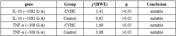 Table 3 presents the compliance of IL-10 (−1082 G/A) and TNF-α (−308 G/A) gene polymorphisms with Hardy–Weinberg equilibrium in both patients and control groups. According to the results, the χ² (HWE) values for both gene polymorphisms did not exceed the statistically significant threshold in either group (p > 0.05). This indicates that the genotype distributions correspond to random population expectations and confirms the genetic representativeness of the study sample.In conclusion, the results of this study demonstrate that IL-10 (−1082 G/A) and TNF-α (−308 G/A) gene polymorphisms are significantly associated with susceptibility to chronic viral hepatitis C and its progression. Analysis showed that for both genes, the AA genotype and A allele were significantly more frequent in patients than in controls, identifying them as risk factors for the development of chronic viral hepatitis C (p < 0.05). Conversely, the GG genotype and G allele were more common in the control group, confirming their protective role against the disease.Furthermore, the genotype distributions of IL-10 and TNF-α in both patients and controls were in accordance with Hardy–Weinberg equilibrium (p > 0.05), indicating the genetic representativeness of the study sample and the reliability of the obtained results.Assessment of IL-10 (−1082 G/A) and TNF-α (−308 G/A) gene polymorphisms plays an important role in the early diagnosis of chronic viral hepatitis C, predicting individual risk, and developing personalized treatment strategies, and represents a promising direction for implementation in clinical practice.