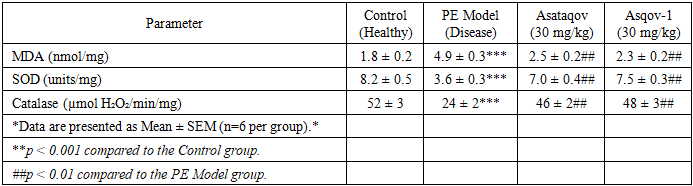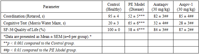 Cite this paper: Ibragim Askarov, Nasrulla Khakimov, Manzura Madaminova, Madina Atabaeva, Evaluation of the Neuroprotective and Antioxidant Activity of "Asqov-1" and "Asataqov" Food Supplements in a Model of Perinatal Encephalopathy in Children, American Journal of Medicine and Medical Sciences, Vol. 16 No. 3, 2026, pp. 1452-1455. doi: 10.5923/j.ajmms.20261603.126.