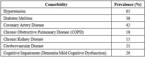 This was a retrospective cohort study conducted at the Tashkent state medical university Multidisciplinary Clinic, Department of Emergency Traumatology, between 2019 and 2023. The study was approved by the institutional review board, and patient consent was waived due to its retrospective nature.Patients included in this study were aged 60 years and older, diagnosed with proximal femur fractures, including intertrochanteric, femoral neck, and subtrochanteric fractures. Only those who underwent surgical fixation or arthroplasty were included. Patients with pathological fractures, pre-existing hematologic disorders, or missing preoperative hemoglobin values were excluded from the study.The majority of patients had significant comorbidities, which are commonly observed in the elderly population with hip fractures. Hypertension was the most frequent comorbidity, affecting approximately 65% of the patients. Diabetes mellitus was present in 38% of cases, while coronary artery disease was documented in 42%. Chronic obstructive pulmonary disease (COPD) and chronic kidney disease were present in 18% and 15% of patients, respectively. Additionally, 21% of the patients had a history of cerebrovascular disease, including prior strokes. Cognitive impairment, such as dementia or mild cognitive dysfunction, was found in 29% of the study population. The Charlson Comorbidity Index (CCI) was calculated for each patient to assess the overall burden of chronic diseases and their impact on mortality risk (Table 1).Table 1. Patient Comorbidities  |
