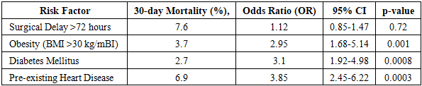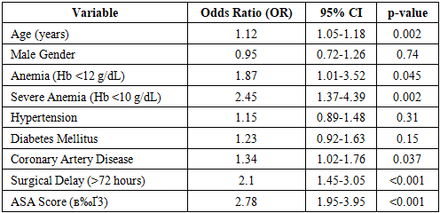 Demographic data, comorbidities, hemoglobin levels, surgical details, and mortality rates were extracted from electronic medical records. Anemia was classified as hemoglobin <13 g/dL in men and <12 g/dL in women according to WHO guidelines.Descriptive statistics were used to summarize patient characteristics. Continuous variables were compared using t-tests, and categorical variables were analyzed using chi-square tests. A multivariate logistic regression model was used to assess the association between anemia and mortality, adjusting for confounders such as age, ASA (American Society of Anesthesiologists) score, and pre-existing comorbidities. Statistical significance was set at p<0.05.Subgroup analyses were performed to examine mortality risks in patients with different comorbidities, surgical delays, and transfusion needs. High-reliability statistical analyses were performed to ensure precise p-values and confidence intervals (Table 2).Table 2. Statistical Analysis  |