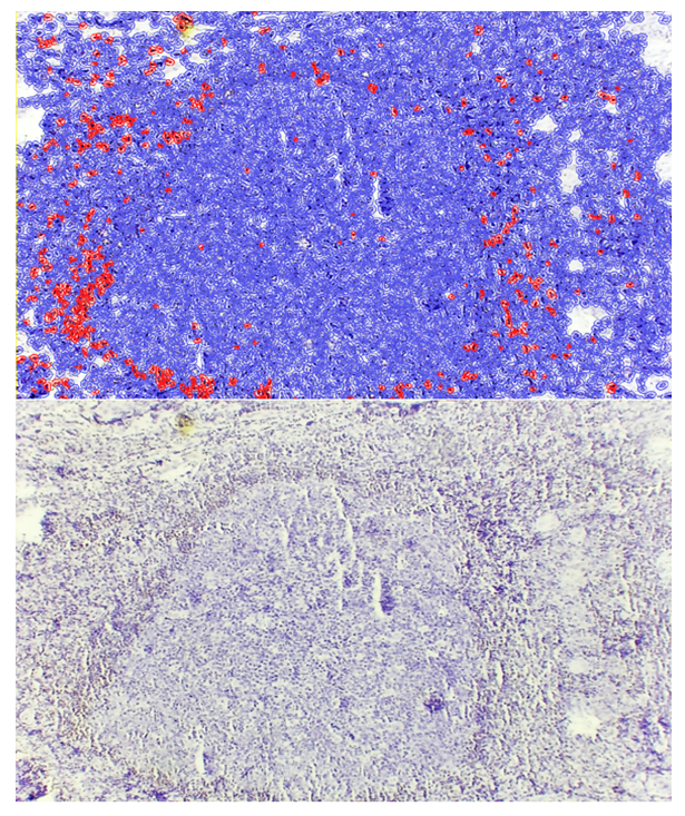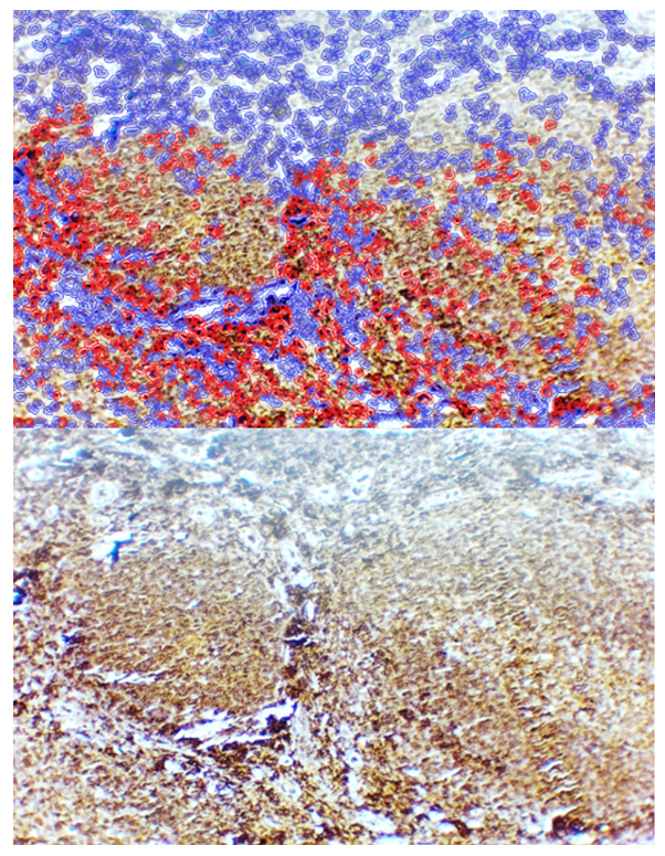 It was observed that the Bcl-2 anti-apoptotic marker was expressed at low levels in certain lymphocytes and reticular cells. However, in the areas surrounding the lymphoid follicles, connective tissue and vascular cells also exhibited low-level expression of this anti-apoptotic marker. Morphometric analysis confirmed that in the lymphofollicular hypertrophy form of the adenoid, the Bcl-2 marker was expressed at a low level, accounting for approximately 17.5% of the tissue area. These findings are consistent with the observed immunohistochemical distribution patterns of Bcl-2 in adenoid tissue (see Figure 2). | Figure 2. Lymphoproliferative form of adenoid tissue, showing almost no Bcl-2 expression in the lymphocytic mantle of the follicle, with low-level expression in the surrounding area. Staining: DAB chromogen. Magnification: 10×40 |