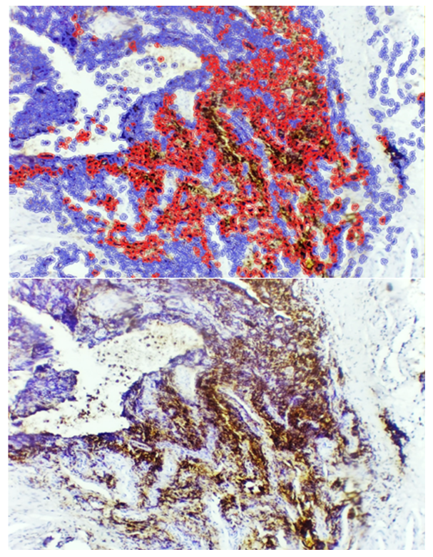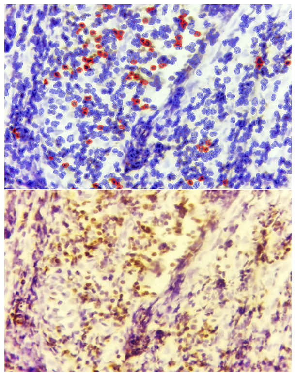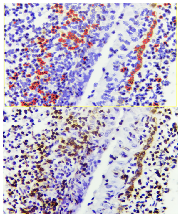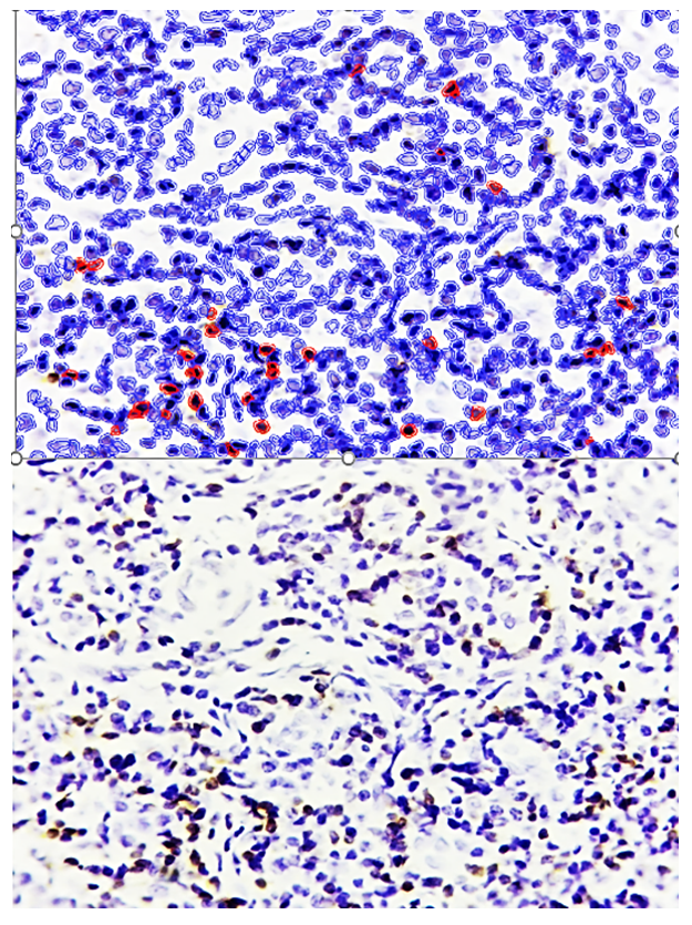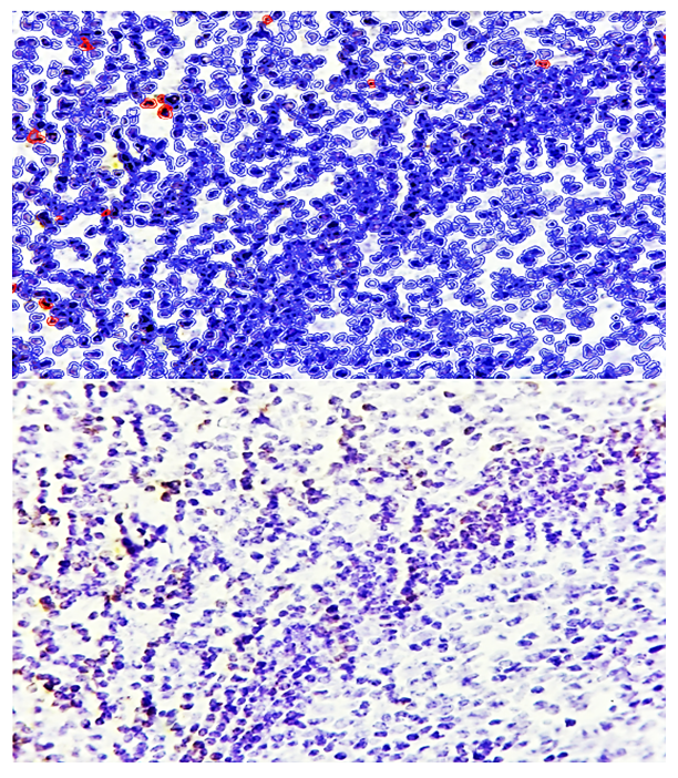 In the interstitial proliferative inflammatory form of adenoid tissue, diffuse infiltration of lymphohistiocytic cells was observed, consistent with previous morphological findings. Immunohistochemical analysis revealed that within this inflammatory infiltrate, certain lymphoid cells exhibited positive expression of the Bcl-2 anti-apoptotic marker, indicating partial retention of anti-apoptotic activity in the inflamed areas (see Figure 3). | Figure 3. Interstitial proliferative inflammatory hypertrophy form of adenoid tissue, showing Bcl-2 expression in certain cells within the infiltrate. Staining: DAB chromogen. Magnification: 10×40 |