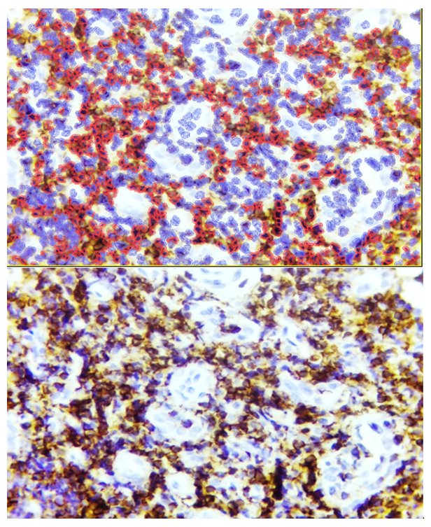 In certain cases of the interstitial proliferative form of adenoid tissue, the basal membrane of the subepithelial layer of the covering epithelium exhibited relatively stronger Bcl-2 expression in reticular cells. Similarly, lymphoid and reticular cells within the lamina propria also demonstrated relatively higher Bcl-2 expression. Morphometric analysis revealed that the average expression level of Bcl-2 in this interstitial proliferative inflammatory form was approximately 24.6%, indicating moderate anti-apoptotic activity in this histological pattern.In the angiomatoid hypertrophy form of adenoid tissue, immunohistochemical evaluation showed pronounced proliferation of endothelial cells within the vessel walls, accompanied by proliferation of pericytes and reticular cells surrounding the vessels. Lymphoid cells within these proliferative areas were also increased in number. Immunohistochemically, Bcl-2 expression was relatively stronger in both reticular stromal cells and lymphoid cells around the proliferating vessels. Reticular stromal cells displayed scattered, fine, brown cytoplasmic granules, whereas lymphocytes showed nearly uniform brown cytoplasmic staining. Overall, Bcl-2 expression in reticular stromal and lymphoid cells surrounding proliferating vessels was significantly higher compared to other adenoid forms, accounting for approximately 68.2% of cells.In the sclerosed hypertrophy form of adenoid tissue, immunohistochemical analysis demonstrated that extensive fibrosis and sclerotic changes resulted in relative atrophy and reduced proliferation of lymphoid cells within the tissue. Consequently, Bcl-2 expression in lymphoid cells between sclerotic bundles was variable, while connective tissue cells, primarily fibroblasts, showed minimal or no expression. Reticular stromal and lymphoid cells within sclerotic bundles exhibited low-level Bcl-2 expression. Morphometric analysis indicated that the average Bcl-2 expression in the sclerosed hypertrophy form was approximately 32.4%, reflecting moderate anti-apoptotic activity in this structural pattern.The Bcl-2 anti-apoptotic protein, which is normally localized to the cell and nuclear membranes as well as mitochondria, exhibited varying levels of expression across different histotopographic forms of adenoid tissue. Specifically, Bcl-2 expression was low in the lymphoproliferative form, moderate in the interstitial proliferative inflammatory form, strong in the angiomatoid form, and moderate in the sclerosed form.CD45, a pan-leukocyte antigen, is associated with the functional differentiation of T-lymphocytes and is expressed at low levels in cortical thymocytes, memory T-cell clones, activated T-lymphocytes, monocytes, and granulocytes. In the lymphofollicular hypertrophy form of adenoid tissue, CD45 demonstrated positive expression throughout all tissue compartments. This widespread positivity reflects the presence of total lymphocyte clones, monocytes, and even granular leukocytes across all morphofunctional regions of the lymphoid tissue. Consequently, the CD45 marker was expressed positively in all lymphocyte subsets, as well as in monocyte-macrophage and granulocytic cells, highlighting its role as a broad indicator of leukocyte presence and functional activity within hypertrophic adenoids (see Figure 7). | Figure 7. Lymphofollicular hypertrophy form of adenoid tissue, showing CD45 expression throughout all tissue compartments. Staining: DAB chromogen. Magnification: 10×40 |