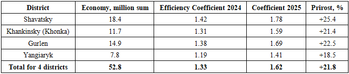 Results of the assessment of the quality of laboratory diagnostic services in the Shavatsky, Khankinsky, Gurlensky, and Yangiaryk districts (2024-2025).Table 1. Economic indicators (2025 compared to 2024)  |