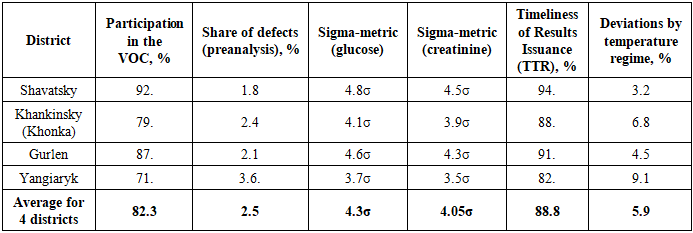 The Shavatsky district showed the best results (92% participation in the VOC in 2025, an increase of 19 percentage points since 2023) thanks to a higher level of equipment and regular training of personnel.The lowest indicator (71%) is in the Yangiaryk district, which is due to problems with the logistics of sample delivery in conditions of remoteness from the regional center and the shortage of thermal containers.Scientific justification: a low level of participation in the VOC directly correlates with an increased percentage of pre-analytical defects (r = -0.87, p < 0.01) and lower values of the sigma metric. Districts with ≥ 85% participation in VOC demonstrate a sigma level ≥ 4σ on key tests, which complies with CLSI and IFCC recommendations.Economic efficiency of implementing a quality assessment systemAccording to preliminary calculations (based on data on the quantity of research and the cost of reagents in 2025):A 1% reduction in pre-analytical defects allows saving an average of 8-12 million soums per year per district (through reduction of repeated sampling and consumables).In the Shovot district, savings amounted to ≈ 18.4 million soums in 2025.In the Yangiarik district - only 6.2 million soums (due to high marriage rates).Total potential effect for 4 districts when bringing all indicators to target values: 42-56 million soums per year.Implementation mechanism1. Stage 1 (Diagnostics): audit of the current state of laboratories according to the checklist for compliance with the requirements of ISO 15189;2. Stage 2 (Standardization): development of unified pre-analytics protocols for nurses of polyclinics and hospitals of the region;3. Stage 3 (Monitoring): monthly data collection on indicators through a digital platform with trend visualization;4. tage 4 (Feedback): quarterly meetings with laboratory managers to analyze deviations and corrective actions.Adaptation to the regional conditions of the Khorezm regionTaking into account the specifics of the region (rural distribution of the population, hot climate affecting sample stability), the system includes additional indicators:- Temperature regime of sample transportation (thermocontainer control);- Delivery time of samples from remote districts (Shavatskiy, Khazarasp) to the central laboratory of the city of Urgench;- Training of medical personnel in pre-analytical procedures (at least 8 hours per year).