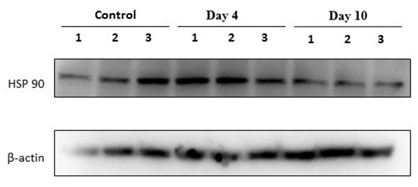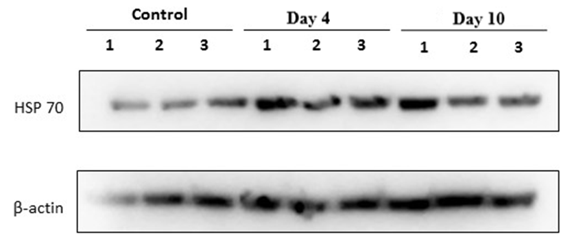 To evaluate the cellular stress response in rats subjected to experimental stress, the expression levels of heat shock proteins HSP70 and HSP90 were assessed using Western blot analysis.As shown in Figure 1, compared with the control group, HSP70 expression was markedly increased already on day 4 in all three samples and remained elevated on day 10. A moderate inter-lane variability was observed. The β-actin bands were generally comparable across samples, allowing qualitative comparison; however, accurate quantitative evaluation requires normalization to β-actin. | Figure 1. Western blot analysis of heat shock protein HSP70 and the loading control β-actin in rat adrenal gland tissues in a forced swimming–induced stress model |