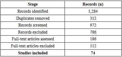 The database search identified 1,284 records (PubMed/MEDLINE: n = 512; Scopus: n = 438; Web of Science: n = 334). After removal of 312 duplicates, 972 unique records were screened by title and abstract.Following initial screening, 786 records were excluded. A total of 186 full-text articles were assessed for eligibility. Of these, 112 full-text articles were excluded due to isolated spinal injury (n = 46), pediatric populations (n = 18), non-traumatic spinal cord injury (n = 21), small case series (<10 patients) (n = 17), and conference abstracts or non-English full texts (n = 10).Ultimately, 74 studies met the inclusion criteria and were included in the final qualitative synthesis.Table 1. PRISMA-ScR flow of study selection  |