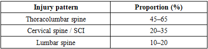 Of the 74 included studies, 48 (65%) were retrospective cohort studies, 14 (19%) prospective cohort studies, 8 (11%) population-based or registry studies, and 4 (5%) randomized or controlled clinical trials. Collectively, these studies represented more than 45,000 patients with spinal trauma, a substantial proportion of whom sustained traumatic spinal cord injury in the setting of multiple trauma.Patient Demographics and Injury PatternsAcross studies, patients were predominantly male (65–80%). Mean age ranged from 32 to 58 years, with elderly patients (≥65 years) comprising approximately 15–30% of contemporary cohorts.Thoracolumbar injuries were the most common injury pattern, accounting for 45–65% of cases, followed by cervical spinal cord injuries (20–35%) and lumbar injuries (10–20%). Cervical spinal cord injury was consistently associated with higher rates of respiratory compromise and intensive care unit (ICU) utilization.Table 2. Distribution of spinal injury patterns  |