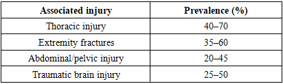 Associated injuries were highly prevalent. Thoracic injuries were reported in 40–70% of patients, extremity fractures in 35–60%, abdominal or pelvic injuries in 20–45%, and traumatic brain injury in 25–50%. These associated injuries were major determinants of ICU admission, mechanical ventilation, and overall morbidity.Table 3. Associated injuries  |